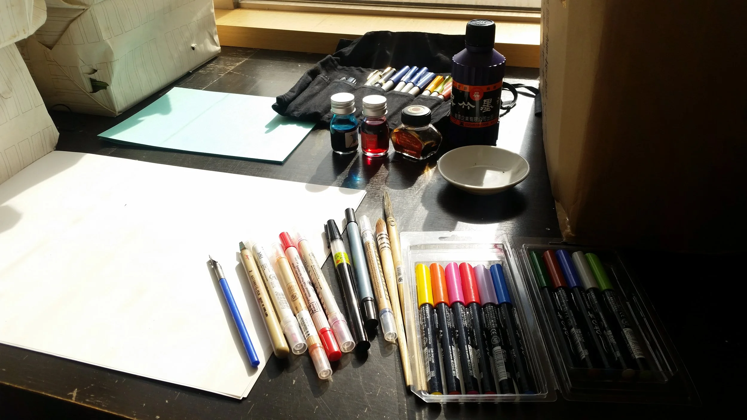 當時的西洋書法工具還不像這幾年選擇這麼多,鋼筆店也不像現在這麼普及,能買到的工具就只有鴨嘴筆和製圖墨水,直到出社會之後,才開始從平頭麥克筆、百樂平行筆開始,有系統的花錢...自學。
