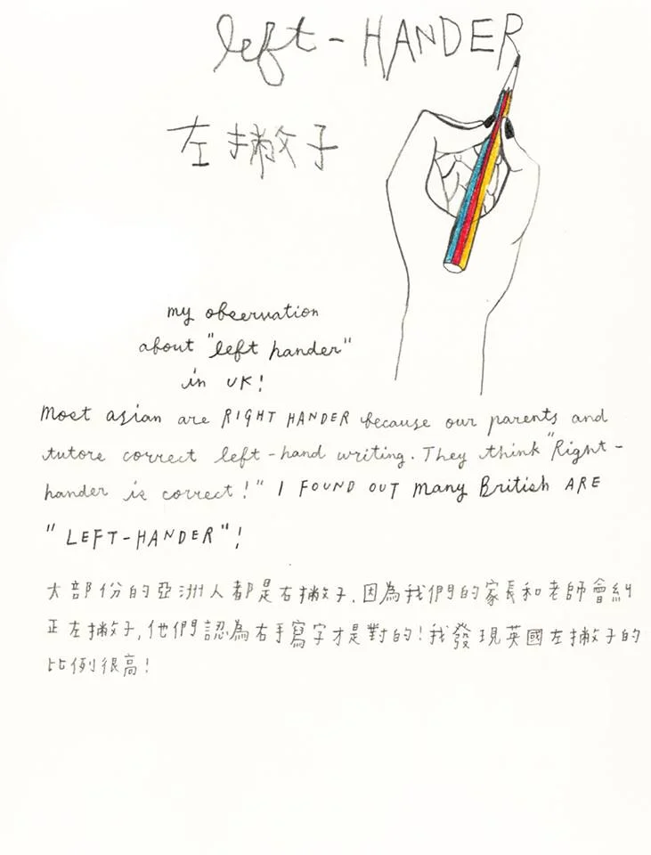 而我的文化觀察也是從這些小事情裡發現的,第一本放鬆的書,在我研究的過程中,發現英國的人有很多左撇子,所以那時每天都帶著一張紙,看到是左撇子的人都會請他(她)們用右手寫名字。我想這或許也是放鬆的一部分吧,爸媽不會規定小孩要用哪一手寫字!