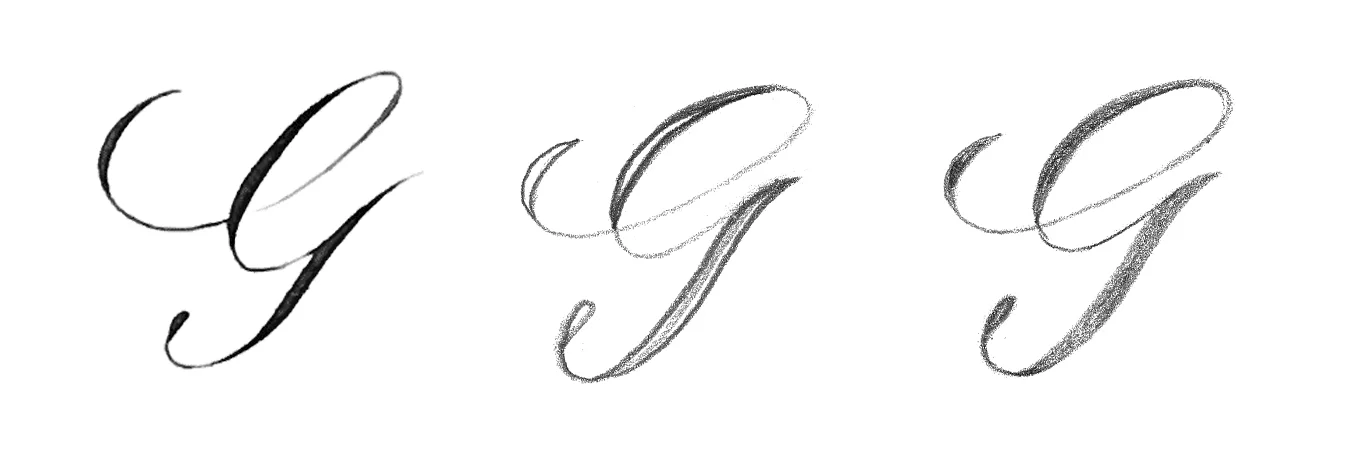 (左)幾不老師書寫之Engrosser's Script大寫G (中)臨摹之書法風字體鉛筆外框 (右)填滿粗筆畫及重覆描繪細筆畫之書法風字體